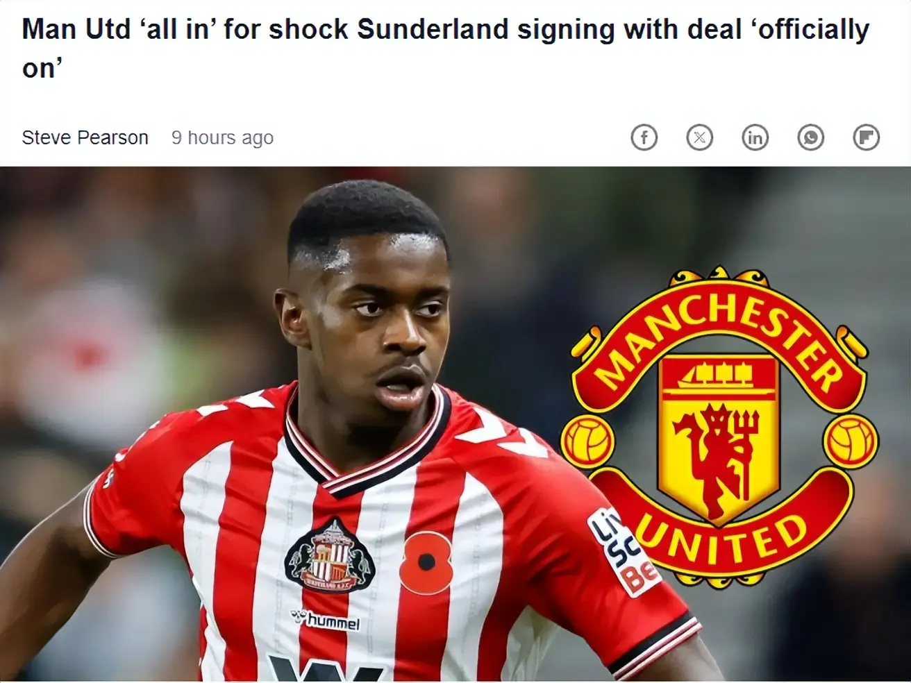 塔沃列里写道:“曼联与切尔西正争夺诺亚·萨迪基!英超战火已提前点燃……这个名字对大众尚陌生,却早被各大球探盯上:桑德兰的刚果中场。